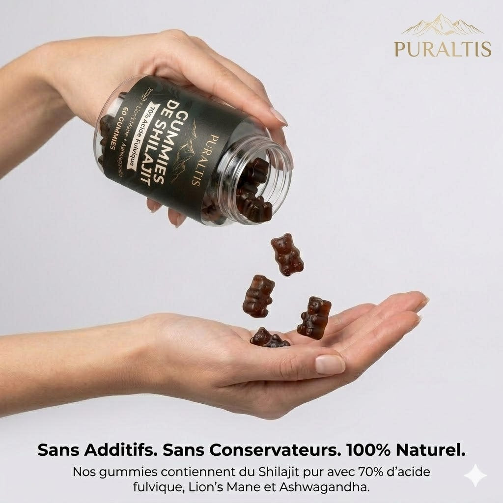 La résine de Shilajit brute a un goût amer et immonde que la plupart des hommes ne supportent pas sur la durée. Le dosage est approximatif et variable d'une prise à l'autre. Nos gummies contiennent exactement 200mg de Shilajit à 70% d'acide fulvique par gummy, ont un goût agréable et se prennent partout en quelques secondes. Même puissance, zéro compromis sur l'expérience quotidienne.